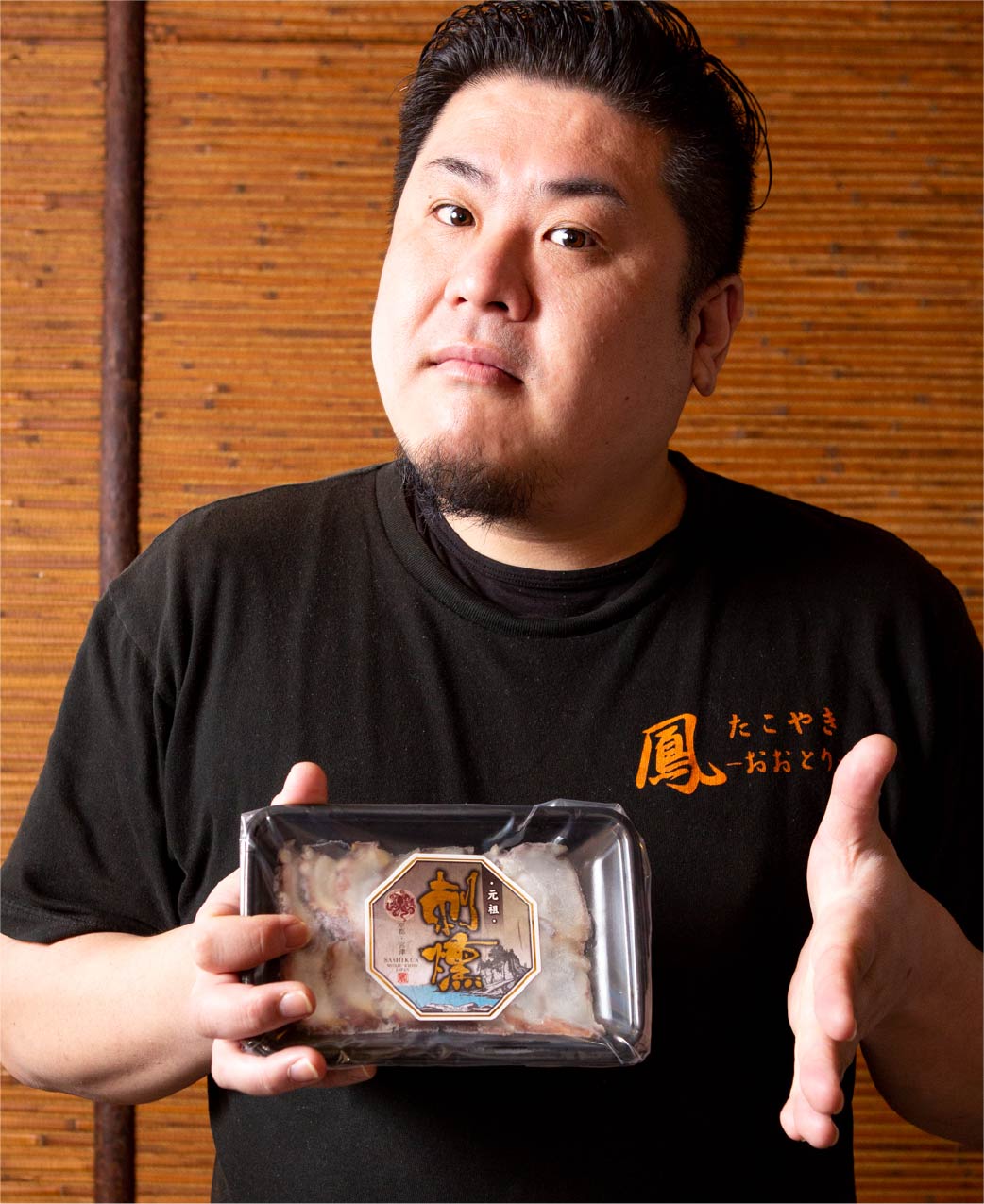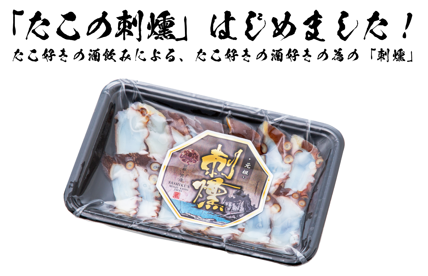 ということで、お待たせしました! 史上初となる刺身と燻製の合わせ技「刺身な燻製・刺燻」発売です! 「たこ好き」を豪語する酒飲みと、「たこにこだわる」たこ焼き屋の私が自信を持ってお届けする、渾身の一品。ぜひ一度ご賞味ください!